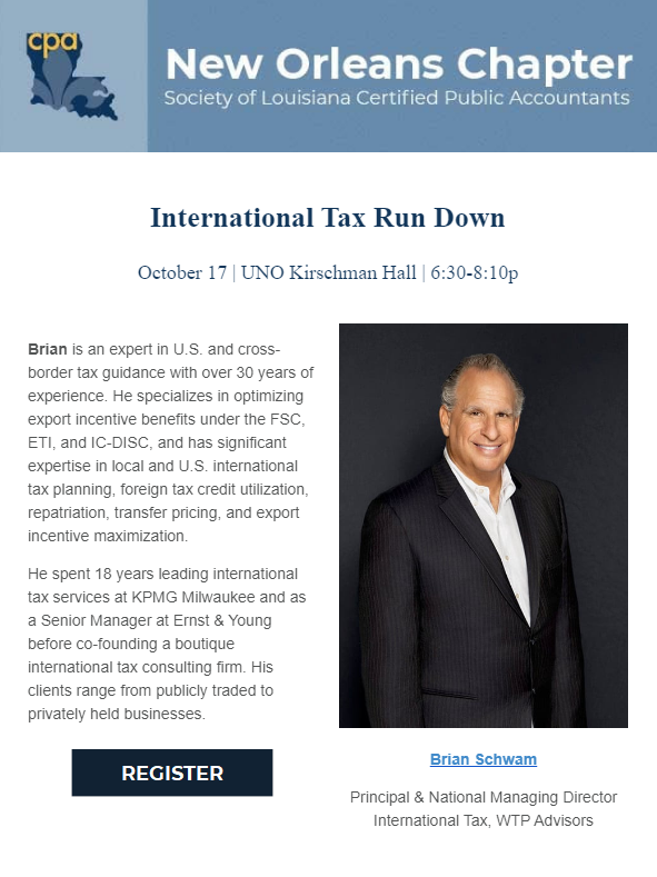 We’re excited to announce that Brian will be featured as a speaker at the Society of Louisiana Certified Public Accountants! With over 30 years of experience in U.S. and cross-border tax guidance, Brian is a recognized expert in the field, particularly in optimizing export incentive benefits through FSC, ETI, and IC-DISC. His extensive background includes specialized knowledge in U.S. and local tax planning, foreign tax credit utilization, repatriation strategies, transfer pricing, and maximizing export incentives.